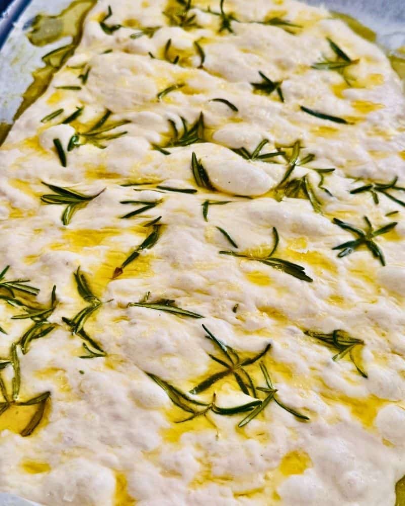 - Dimple and drizzle: Drizzle the top with olive oil, then press your fingertips into the dough to create deep dimples. Top with flaky salt, rosemary, or any desired toppings.