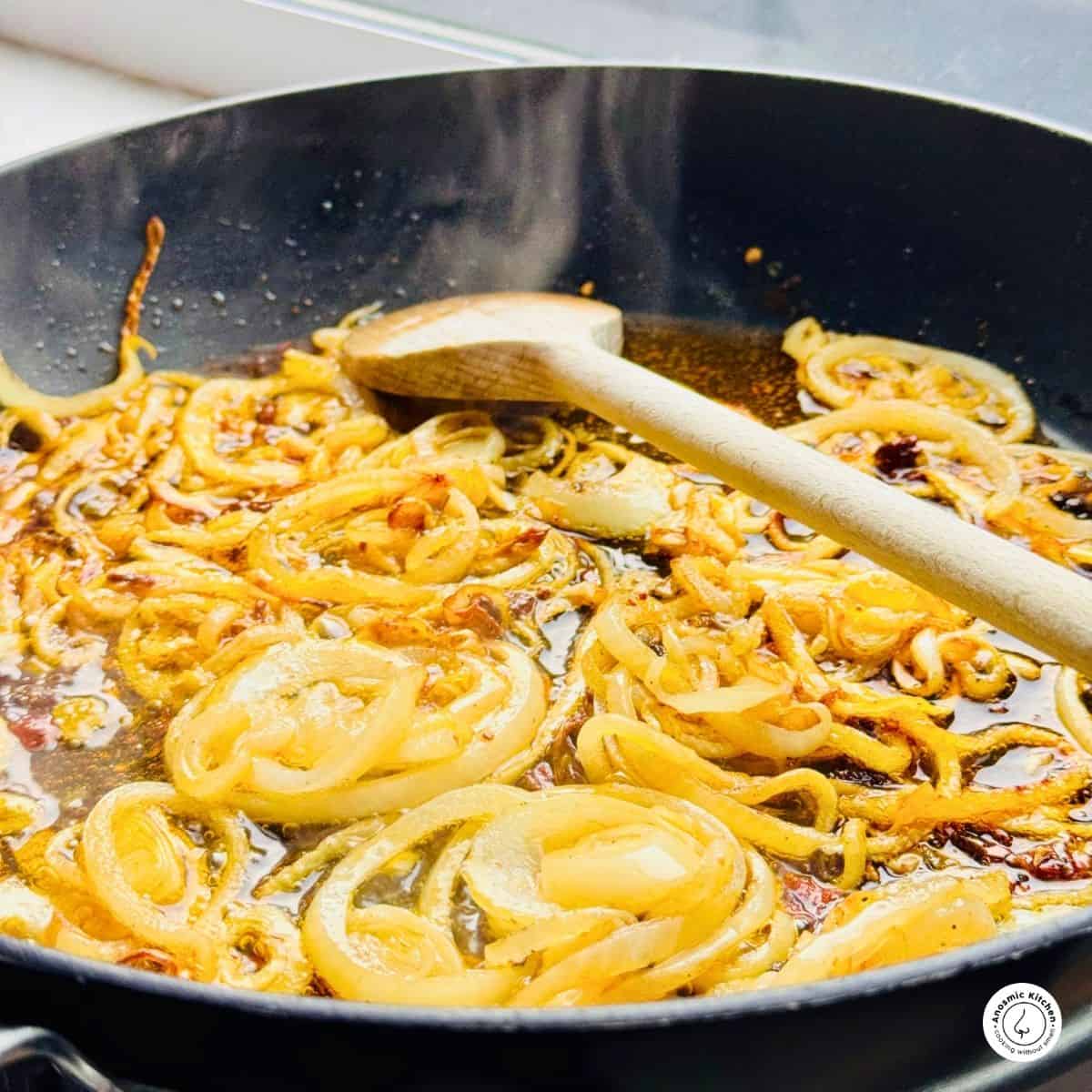 - Caramelize the Onions: In a large skillet, heat olive oil over medium heat. Add onion rings and sauté, stirring often, for 10–12 minutes until deeply golden and soft.