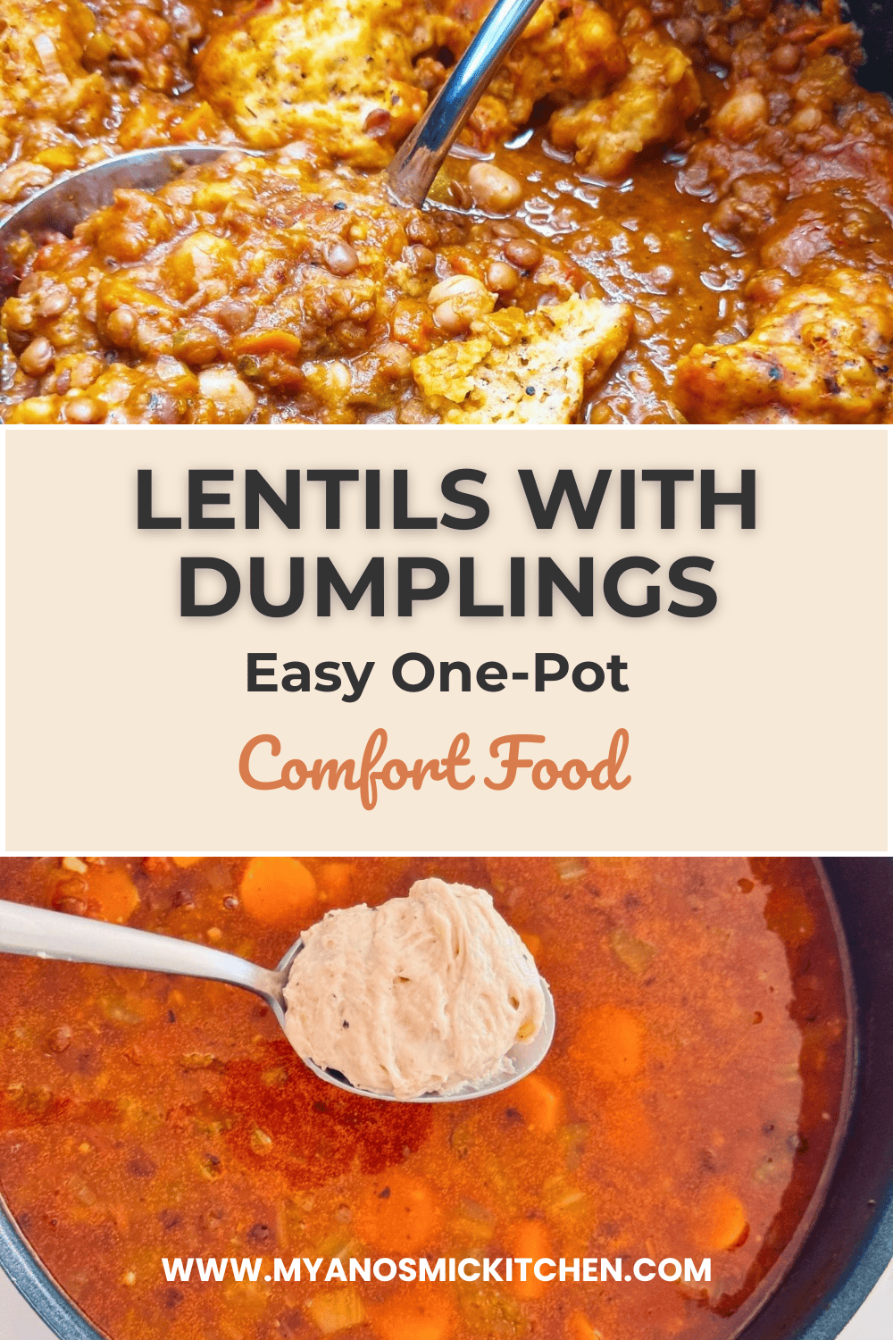 This Lentils with Dumplings stew is cozy, comforting, and super easy. Perfect for family dinners or a meatless night. Pin it for your next cozy meal!
